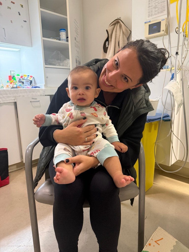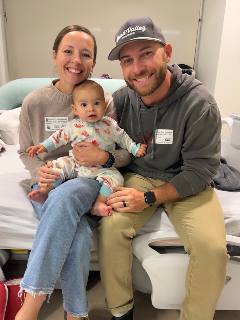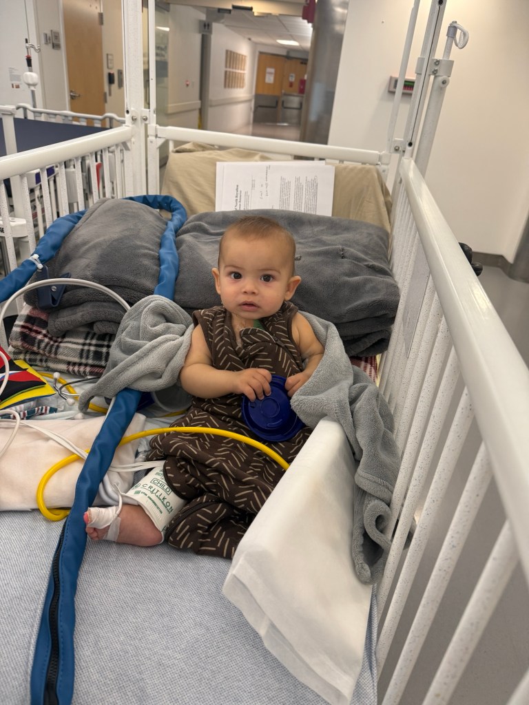 Our little man took it like a champ in his little hospital crib while playing with his toys.