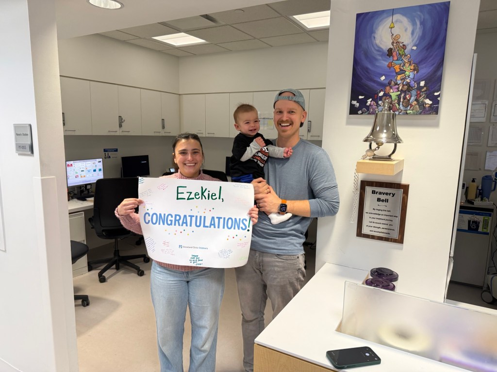 Zeke was able to “ring the bell” to signify end of treatment and was supported with lots of friends and family beside him.